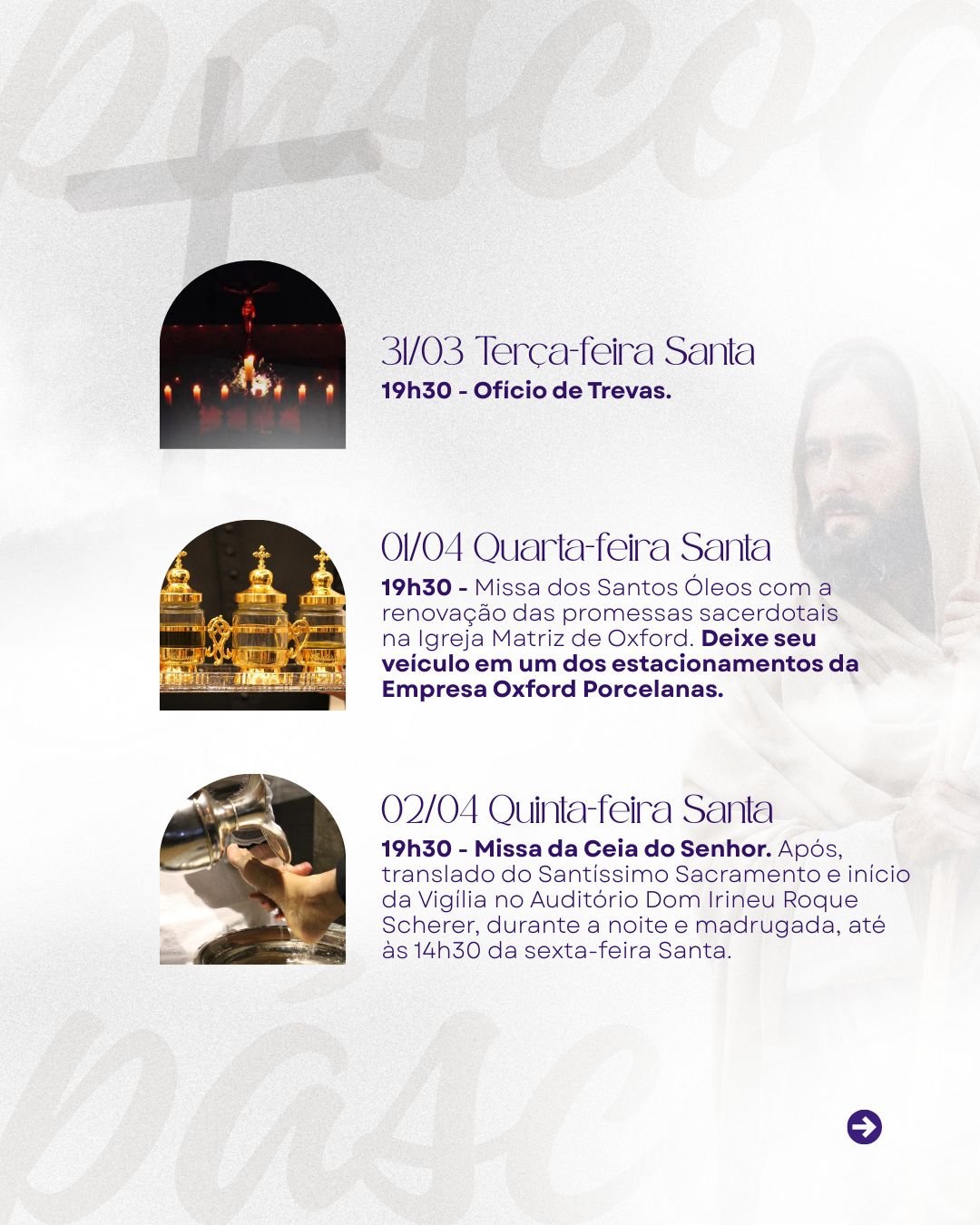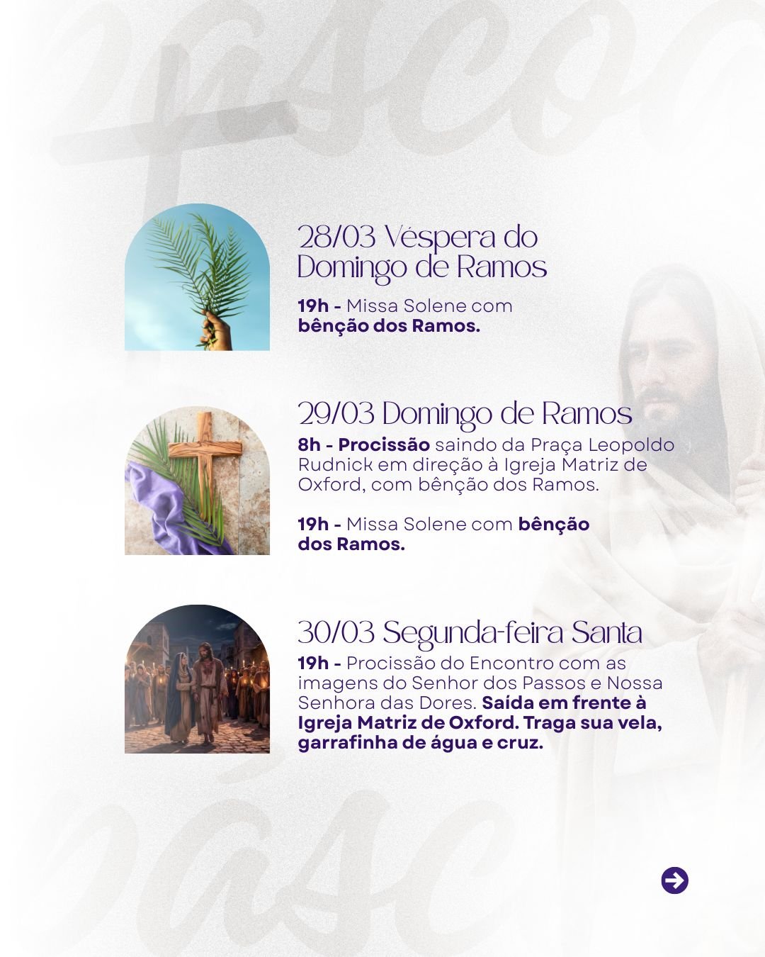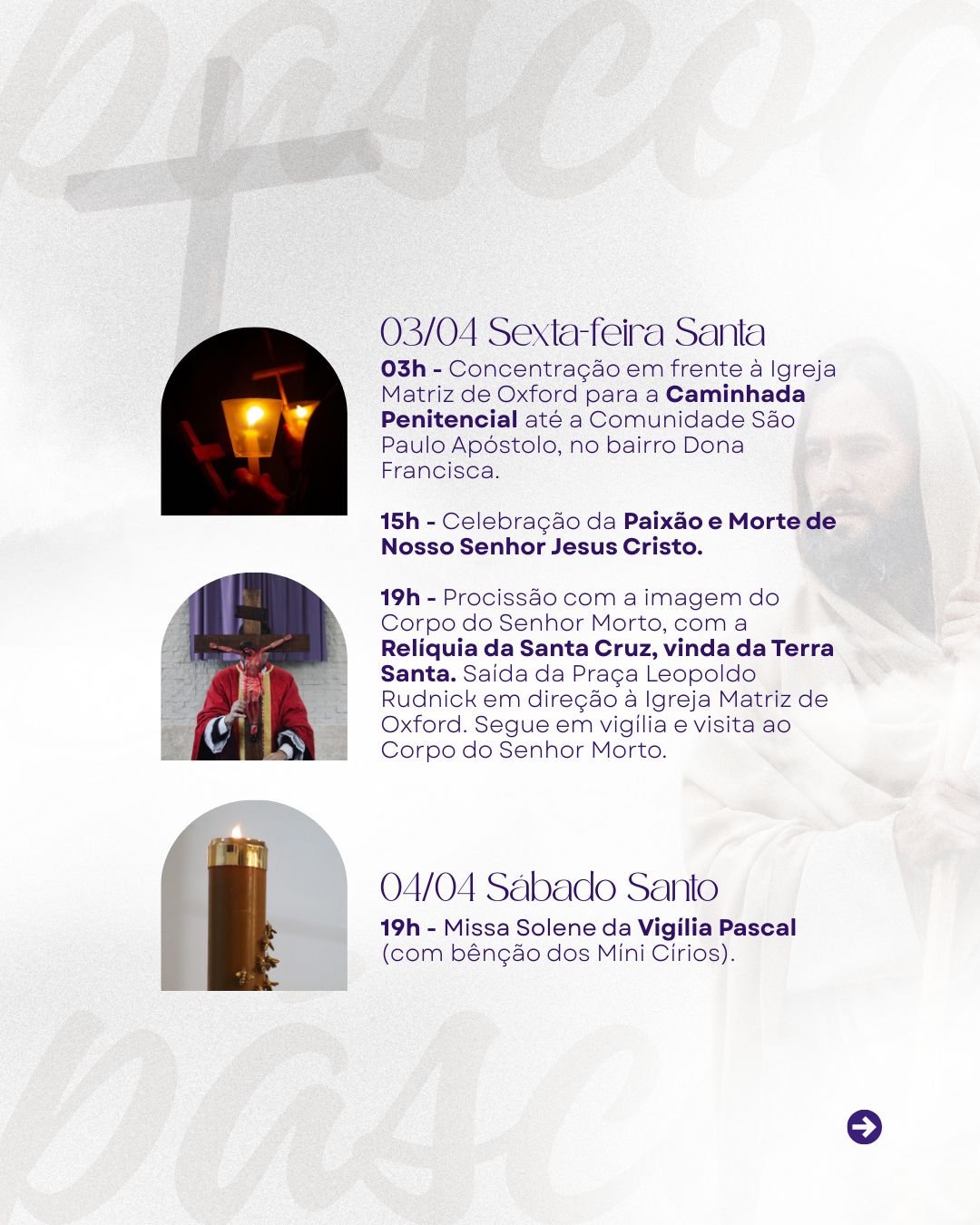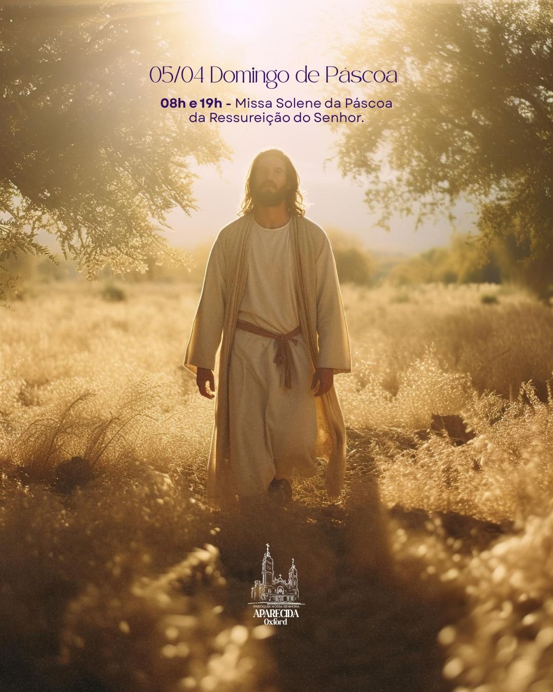 A Paróquia Nossa Senhora Aparecida de Oxford convida toda a comunidade para viver com fé e devoção a Semana Santa, tempo sagrado em que recordamos a Paixão, Morte e Ressurreição de Nosso Senhor Jesus Cristo.